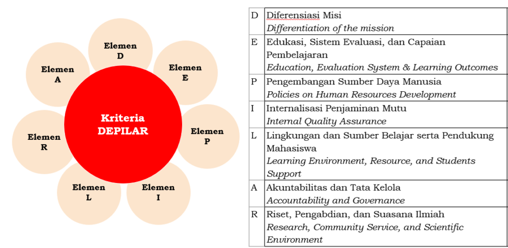Tujuh elemen kriteria (D–E–P–I–L–A–R) digunakan sebagai dasar asesmen unik LAMDEPILAR untuk memastikan bahwa program studi memenuhi standar nasional pendidikan tinggi, sekaligus memiliki keunggulan kontekstual sesuai karakteristik bidang keilmuan. Penilaian dilakukan secara komprehensif dengan memperhatikan ketercapaian standar, konsistensi implementasi, serta bukti dampak yang dihasilkan.